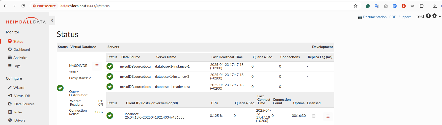 By default, an embedded database supplied with Heimdall is used to store logs and statistics, however there is an option to select user configured data source (MySQL, PostgreSQL, Oracle and SQL Server supported). If Heimdall is unable to establish connection to selected source at any point it will fall back to using embedded one. User configured in selected data source has to have database root privileges.