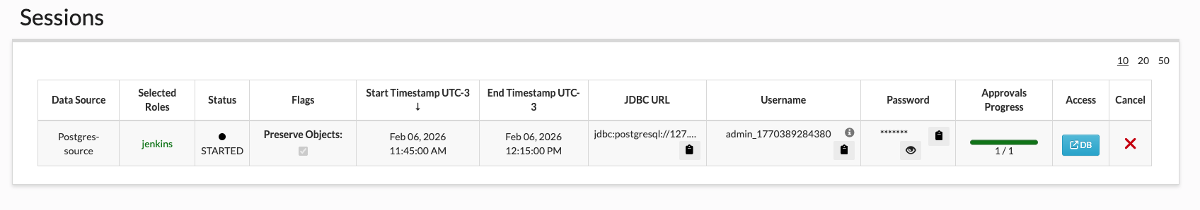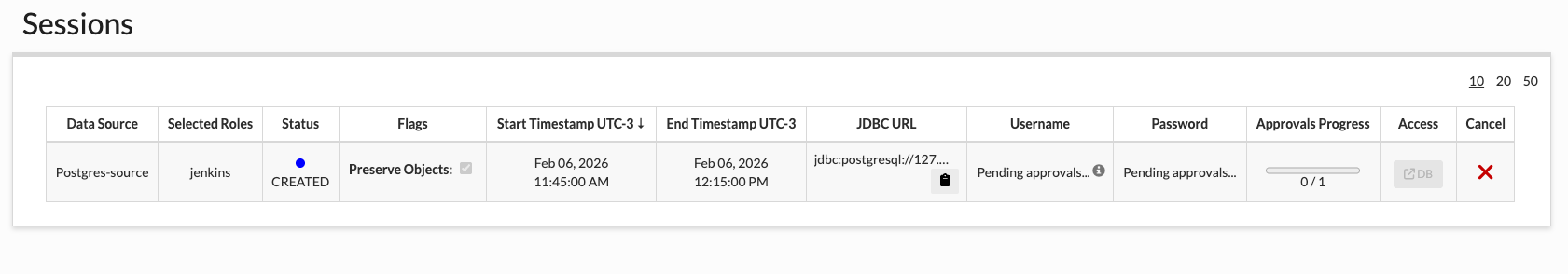 Locate the Session: Once requested, your session will appear in the list. Initially, the DB button in the 'Access' column will be disabled.