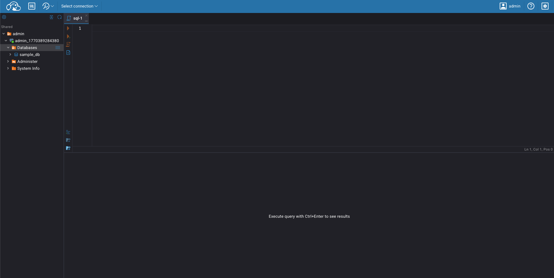 - Start Managing Data: Click the DB button to open CloudBeaver in a new tab. The session is pre-initialized, so you do not need to manually input credentials.